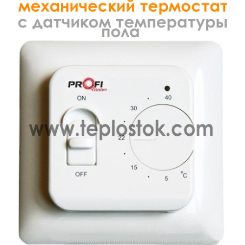 Електронно-механічний термостат (терморегулятор) Profi Therm МЕХ - простий пристрій, призначений для регулювання температури в системах «тепла підлога» на основі нагрівальних кабелів. Термостат являє собою блок управління, що складається з тумблера живлення та спеціального поворотного ролика. На ролику нанесена розмітка з позначенням температур від +50С до +400С. В комплект термостата входить виносний датчик температури підлоги на проводі. Правильність розміщення датчика підлоги при монтажі безпосередньо впливає на працездатність системи. Розмістіть головку датчика, між витками кабелю, вміщену в гофровану трубку діаметром 16мм для можливості його майбутньої заміни. Термостат має компактні розміри 80*80*35мм і призначений для внутрішнього монтажу в стандартний підрезетник діаметром 60мм.
